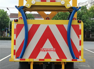 五十铃防撞缓冲车上装配置:防撞车尾部设置防撞缓冲块,防撞缓冲块采用液压升降装置,还配备车载一体化的电子屏、电子箭头标志牌、频闪灯及爆闪灯多种警示灯,能够为后方车辆提供警示和指示方向。箭头指示标志可对左、右及禁止通行进行导向指示,对道路车辆提供主动安全引导和安全警示,较大限度降低施工对交通流量的影响并确保安全。尾部升降和灯具采用遥控控制,可在车辆附近安全控制防撞缓冲块的升降和警示灯的开关。